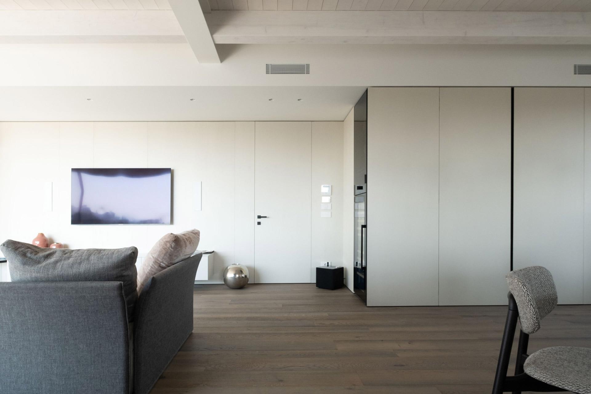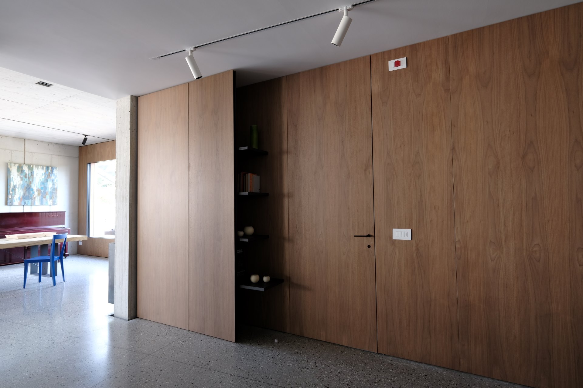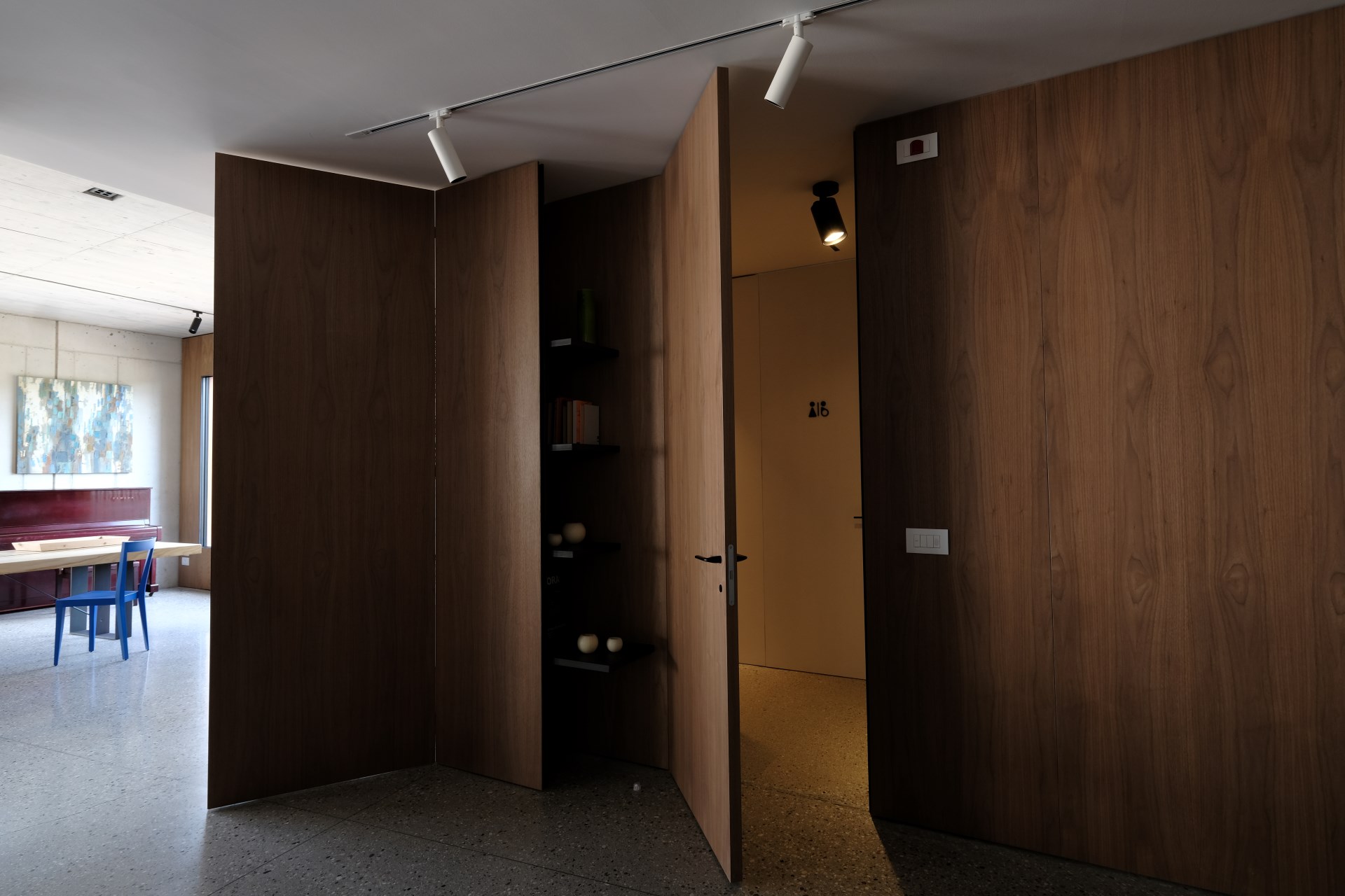 Copre e scopre, definendo pareti pulite e ordinate, anche in ambienti complessi come corridoi o zone di passaggio. Il risultato è una soluzione elegante e discreta, capace di unificare elementi diversi in un unico disegno pulito.