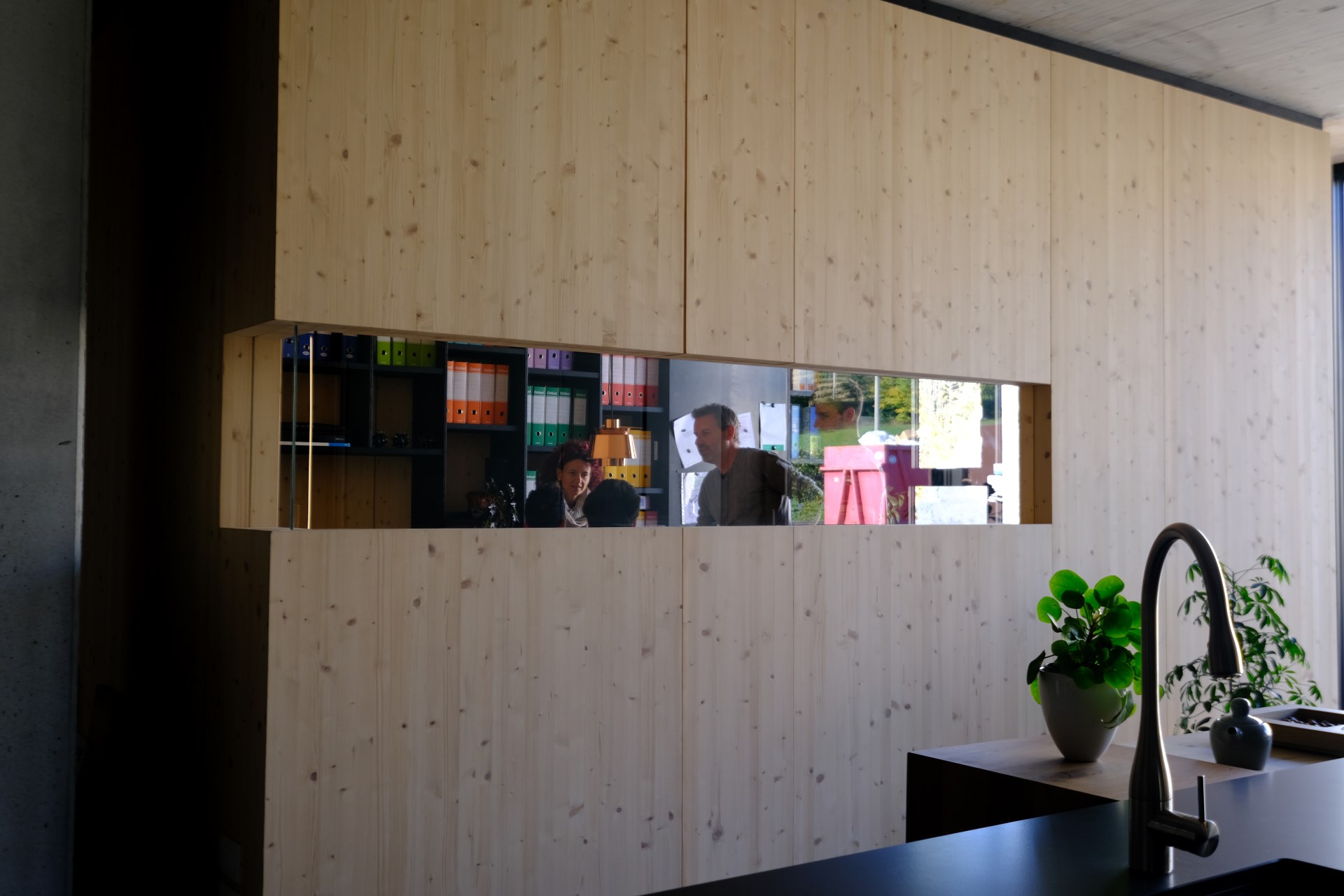 Integra porte e armadi a tutta altezza, permettendo di organizzare e nascondere lo spazio in modo continuo e coerente.