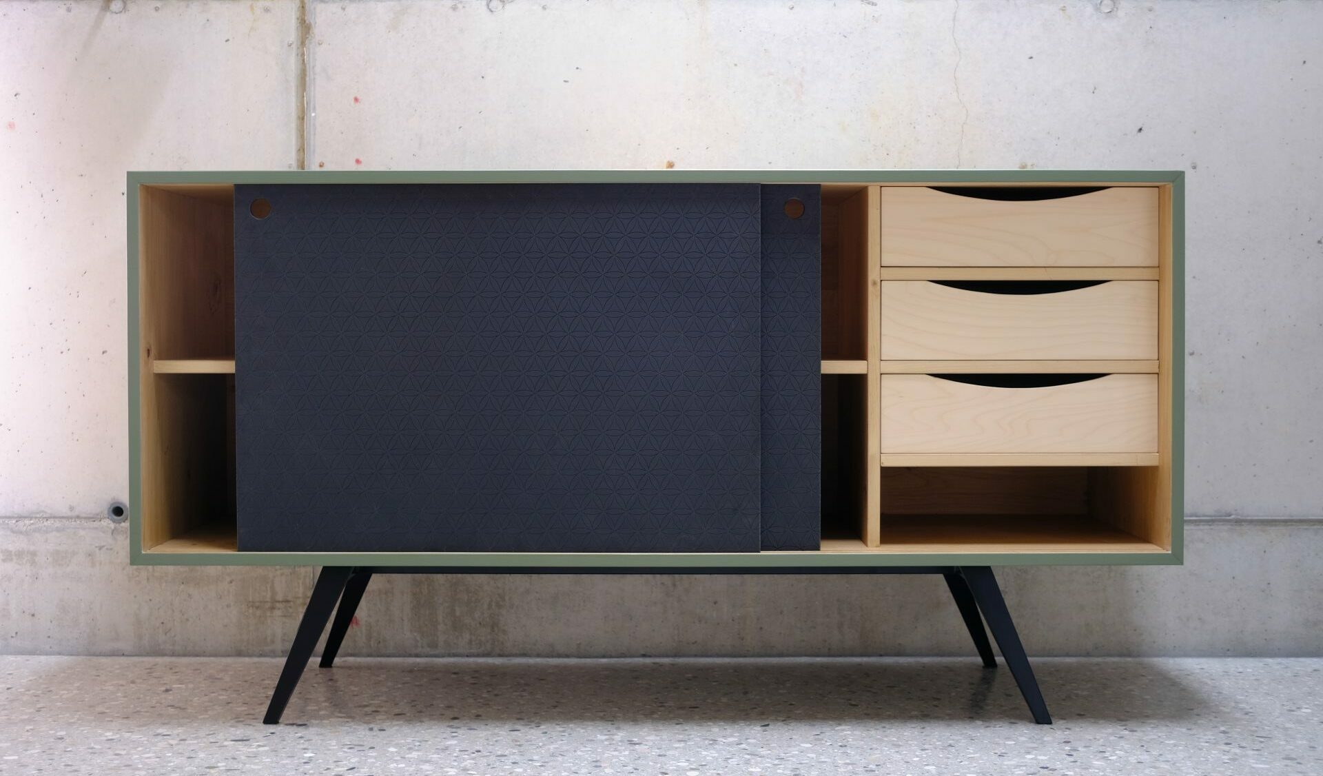 Le ante scorrono nelle guide, riprendendo il sistema già adottato in Forrest, e il disegno inciso richiama le vetrine di un tempo. All’interno, i cassettoni organizzano lo spazio in modo pratico e capiente.