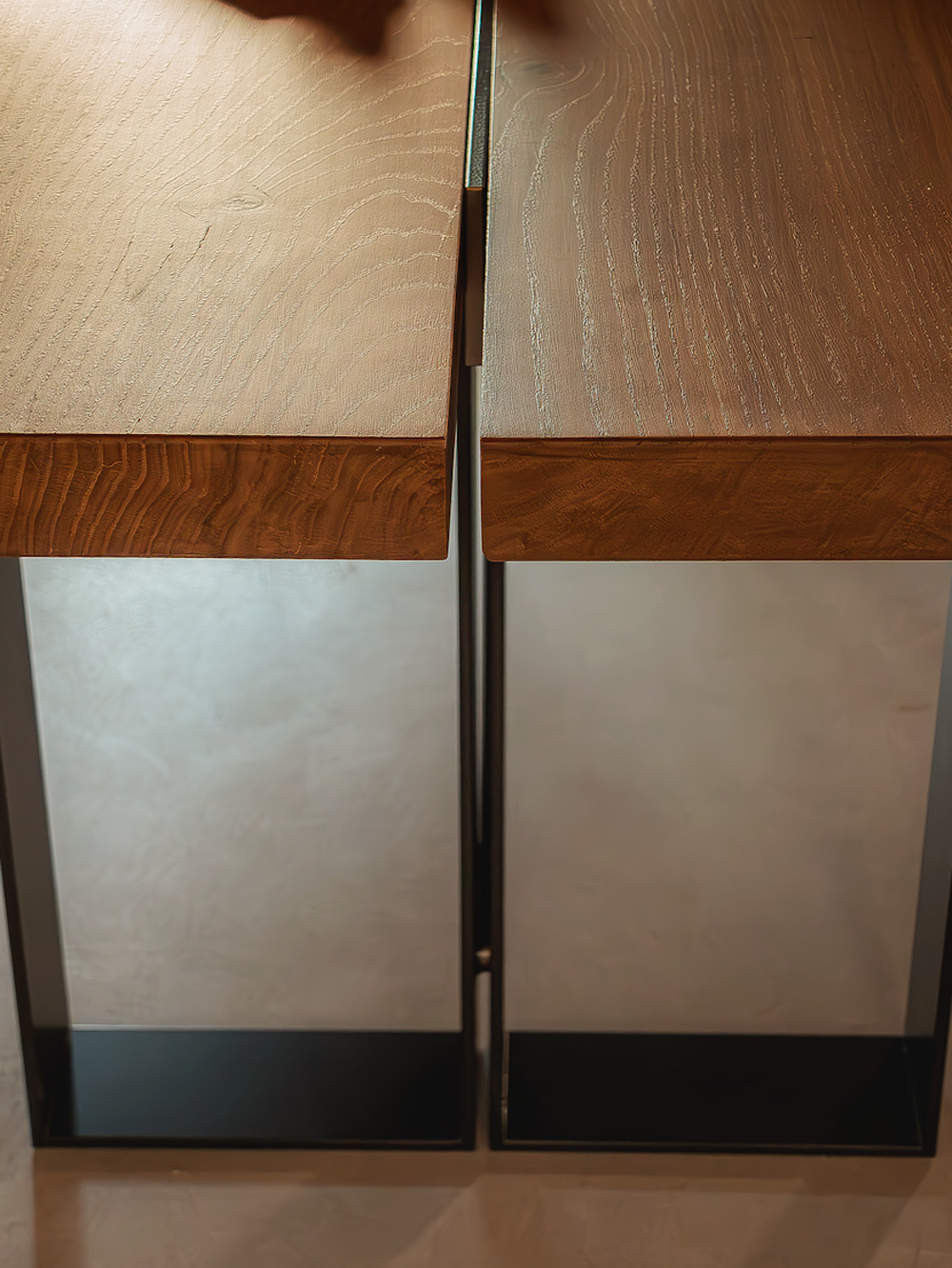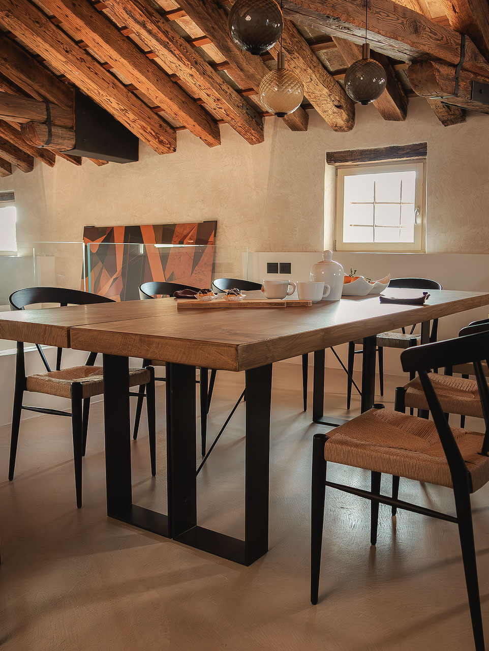 Filiberto è un tavolo di grandi dimensioni, ispirato alla tradizione. La struttura in ferro naturale dialoga con piani in legno massello di forte spessore, definendone il carattere deciso.