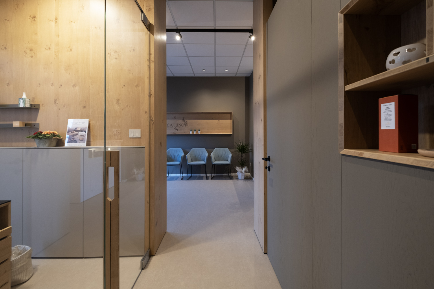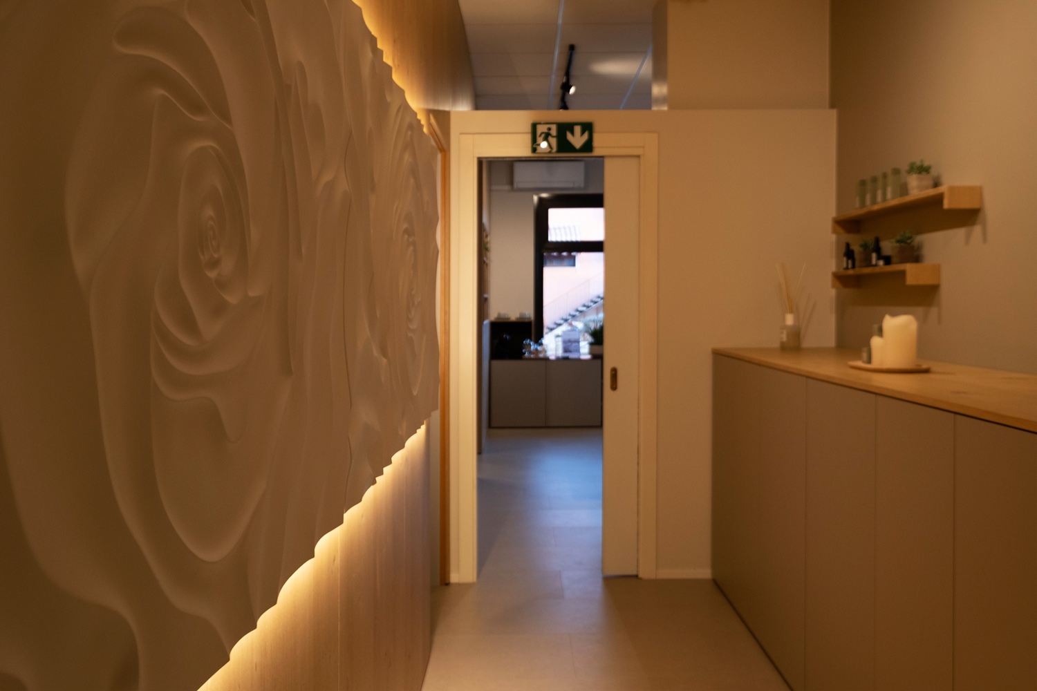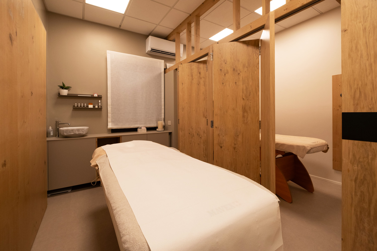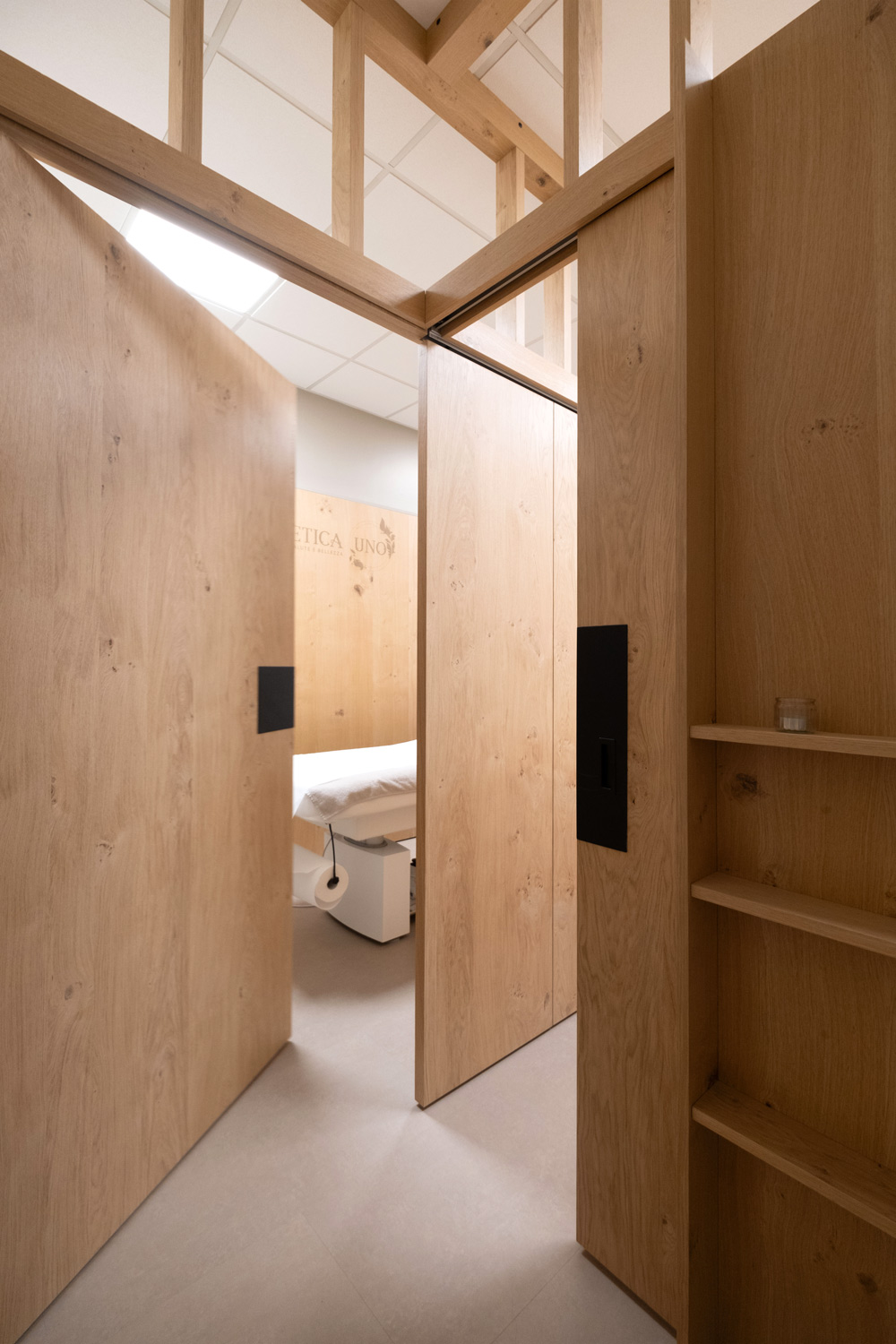 Particolare attenzione è dedicata al laboratorio: la parete abbattibile per i trattamenti di coppia, completamente realizzata in rovere naturale, garantisce flessibilità senza perdere calore e coerenza materica.