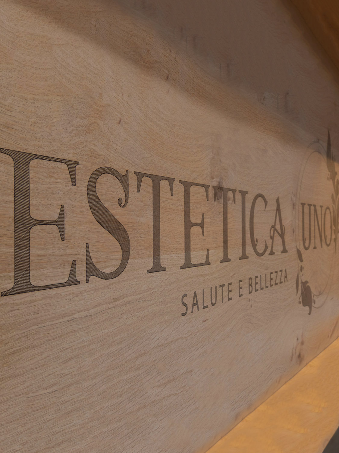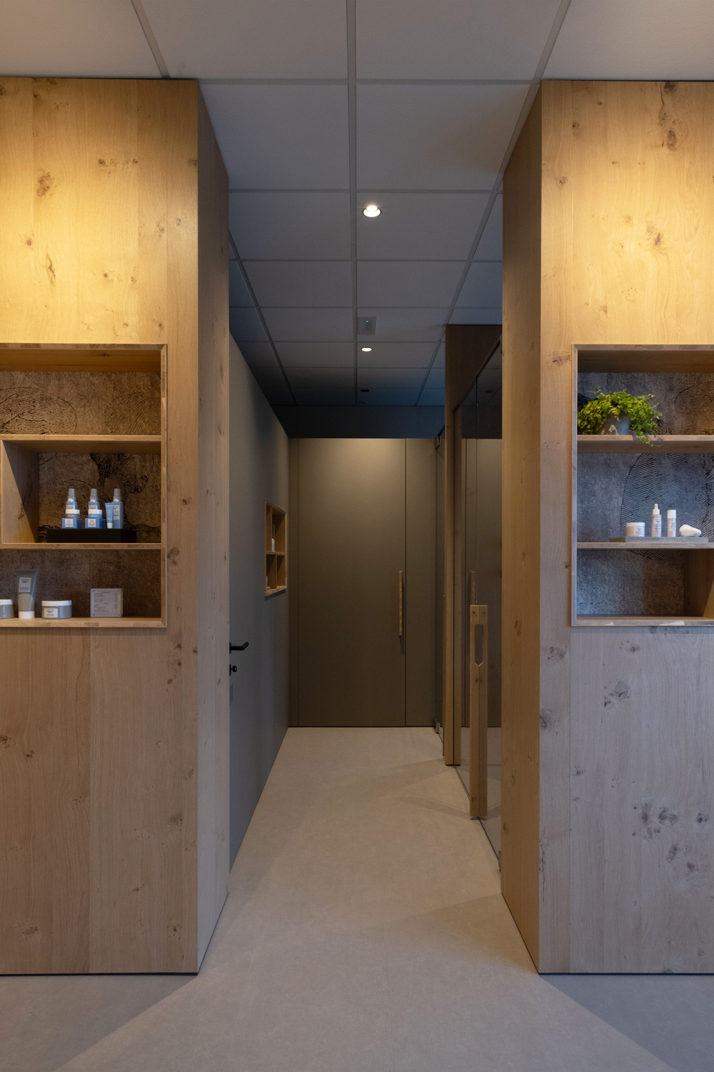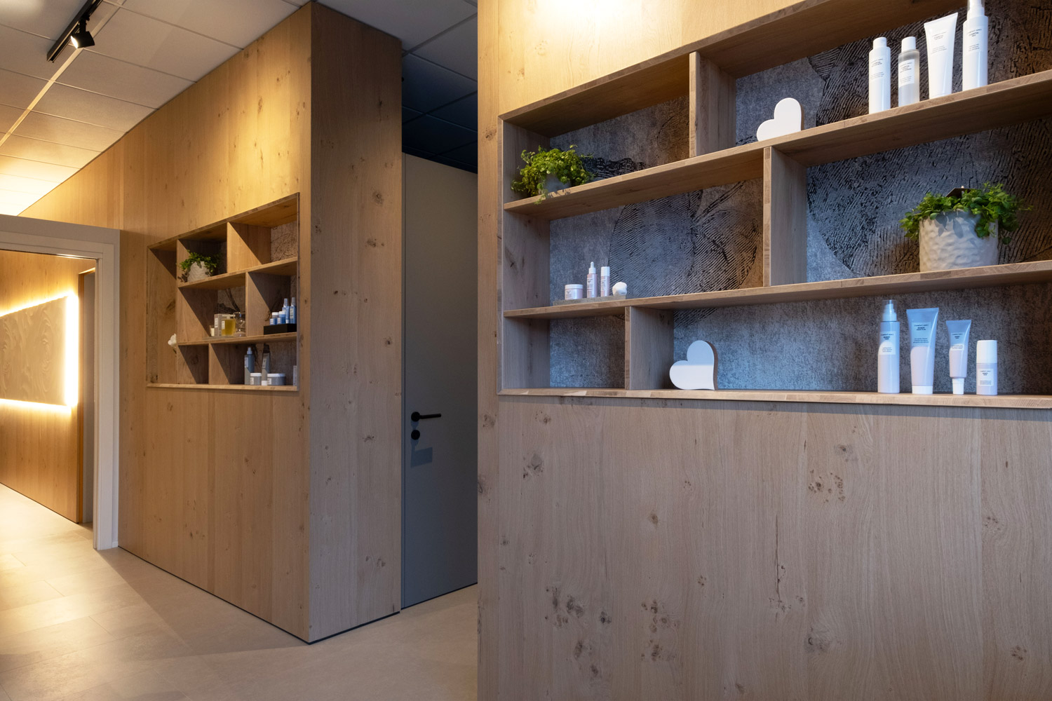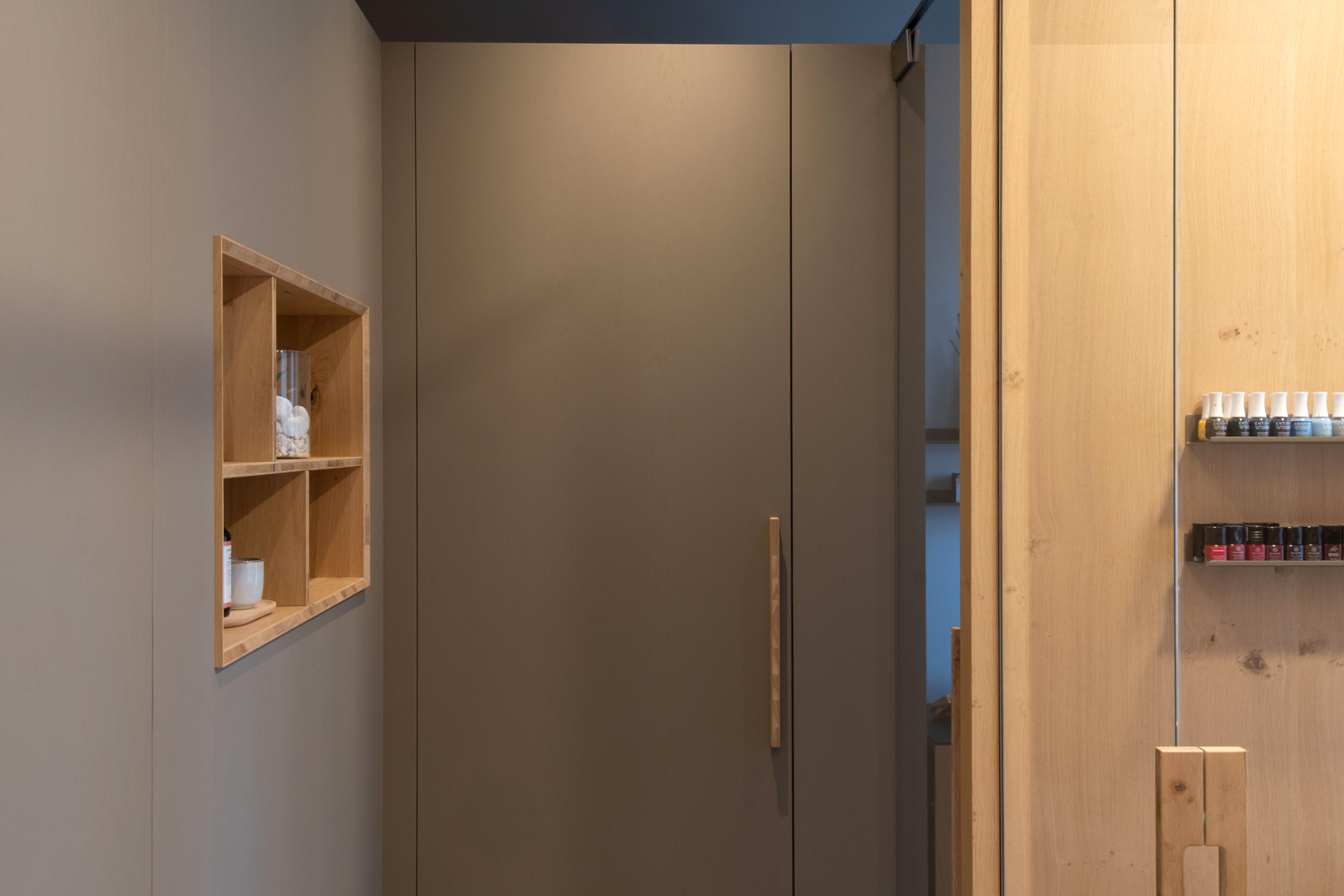Particolare attenzione è dedicata al laboratorio: la parete abbattibile per i trattamenti di coppia, completamente realizzata in rovere naturale, garantisce flessibilità senza perdere calore e coerenza materica.