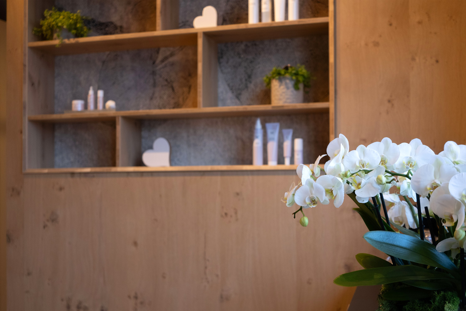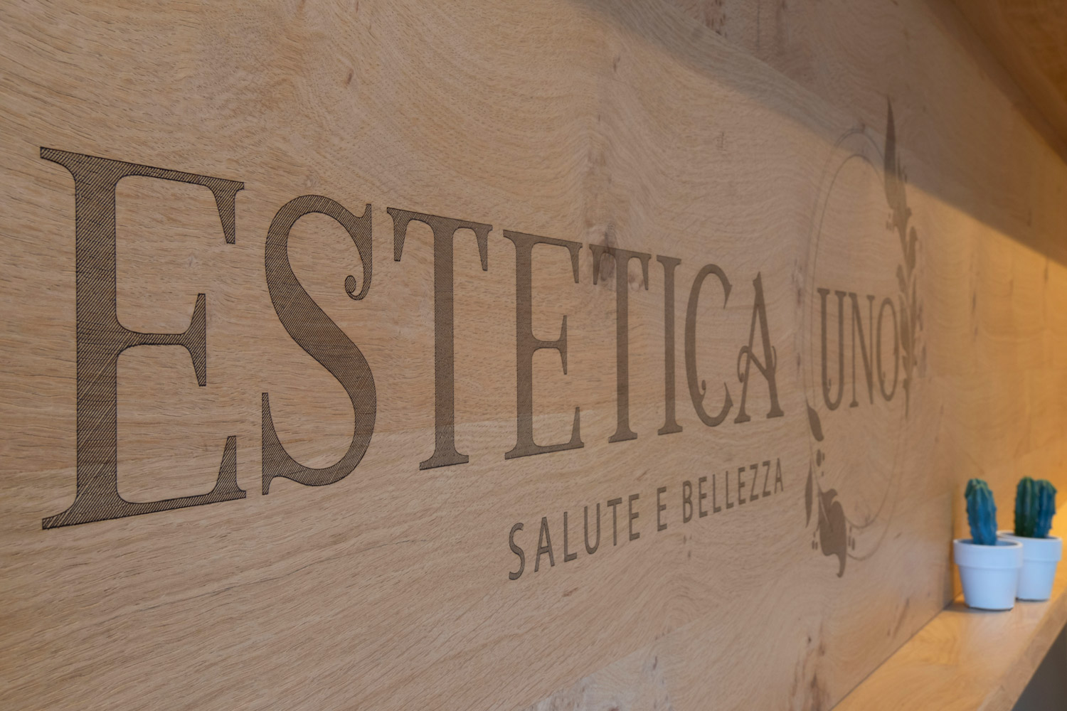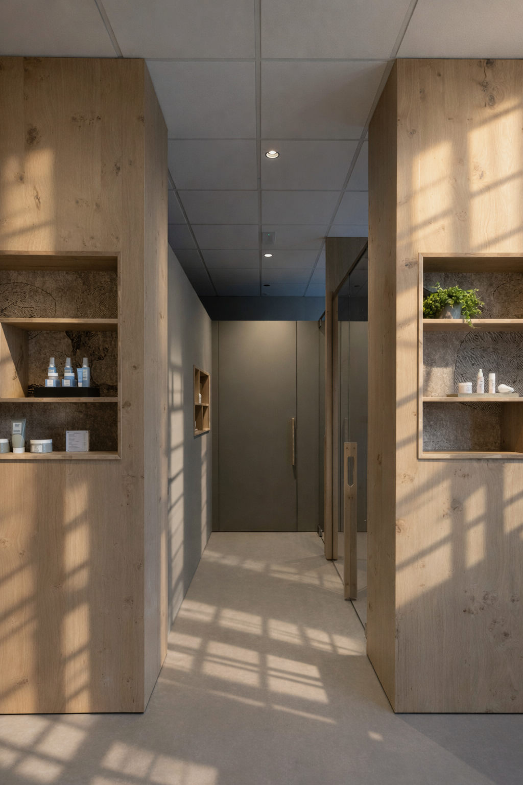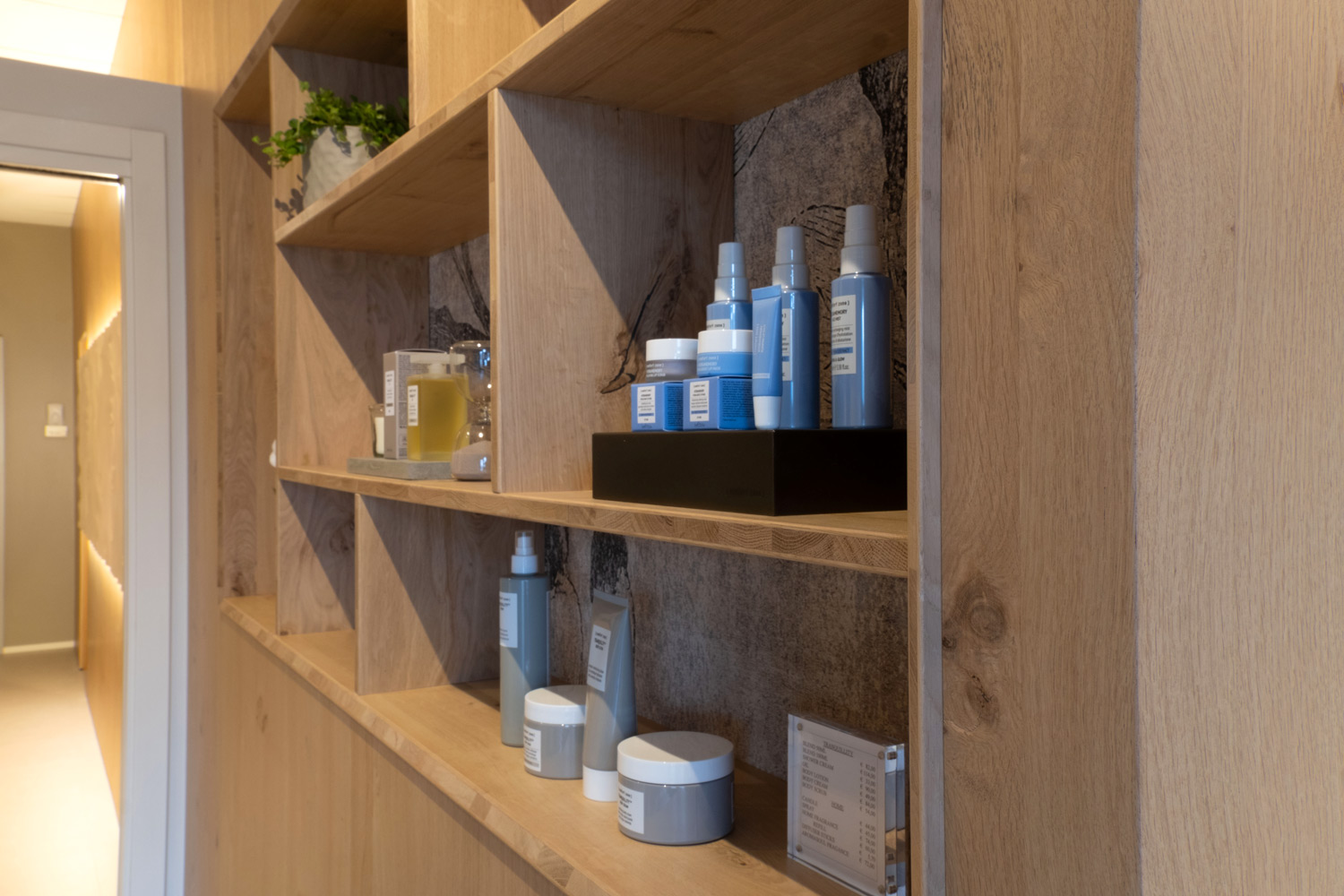 Particolare attenzione è dedicata al laboratorio: la parete abbattibile per i trattamenti di coppia, completamente realizzata in rovere naturale, garantisce flessibilità senza perdere calore e coerenza materica.