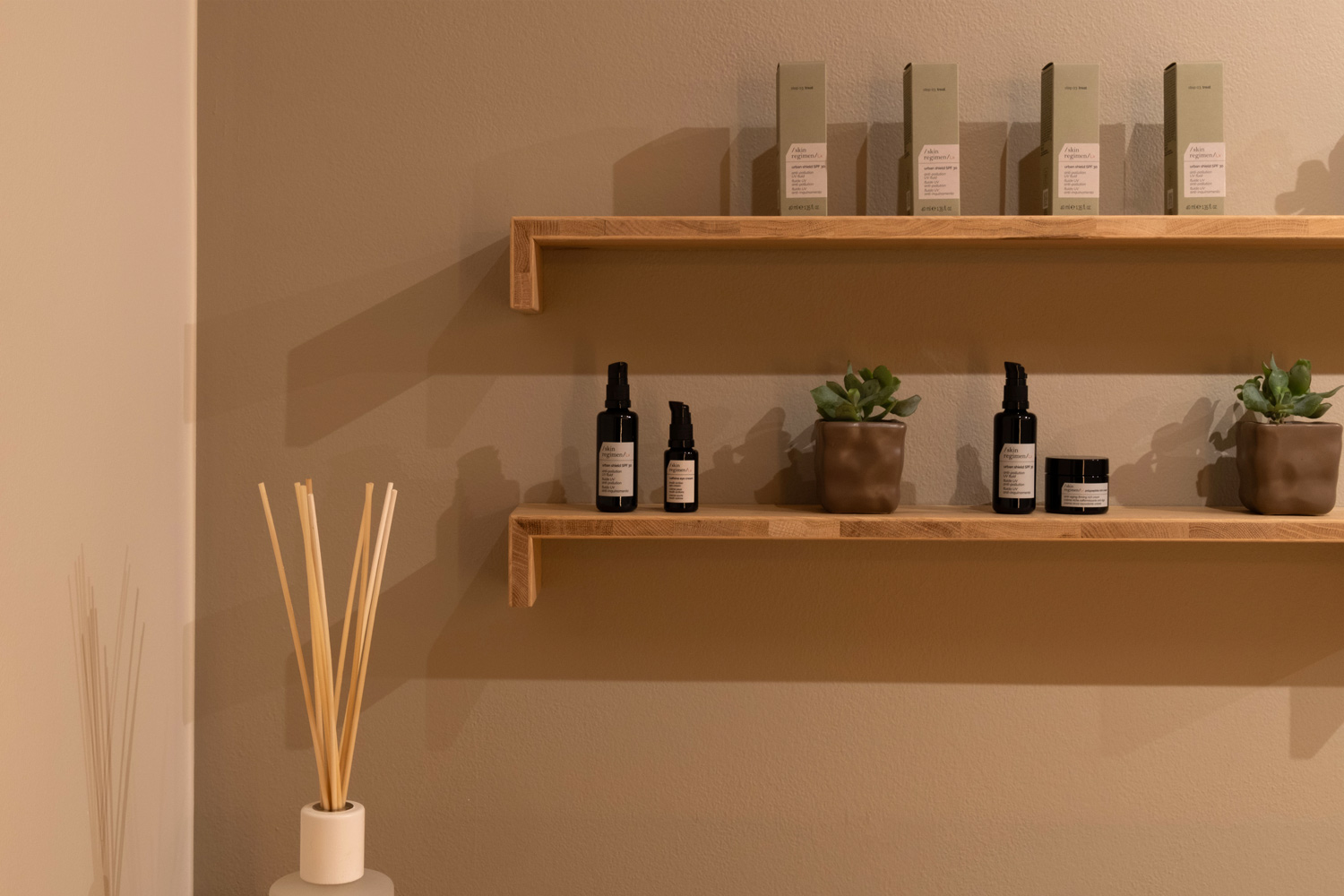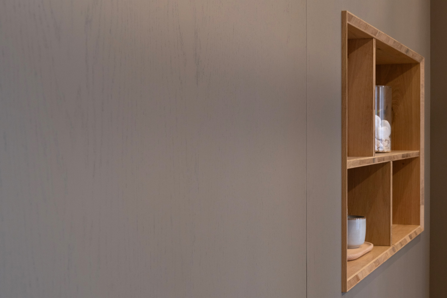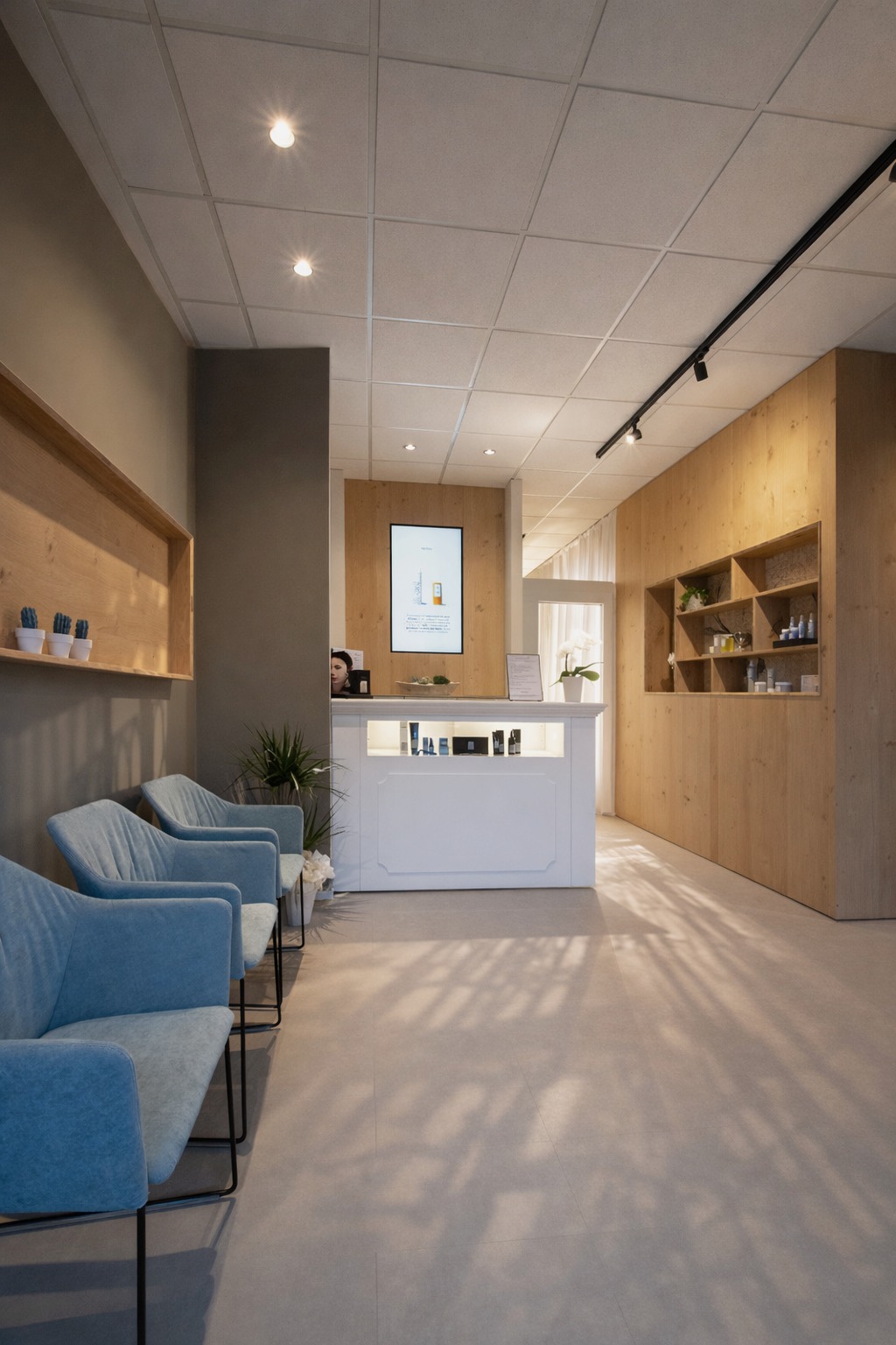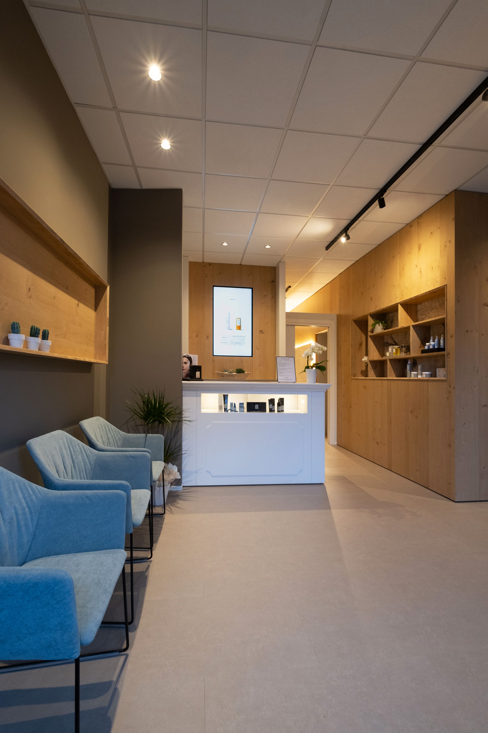 Particolare attenzione è dedicata al laboratorio: la parete abbattibile per i trattamenti di coppia, completamente realizzata in rovere naturale, garantisce flessibilità senza perdere calore e coerenza materica.