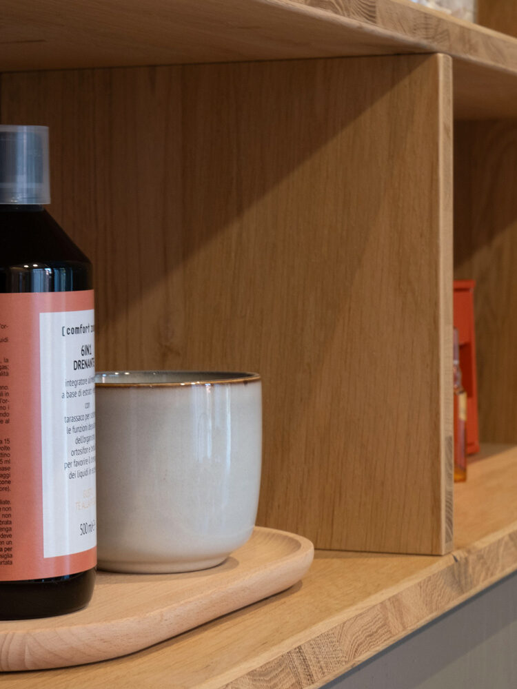 La nostra boiserie diventa l’elemento narrativo centrale: organizza l’ingresso, distribuisce gli spazi e allo stesso tempo accoglie ed espone i prodotti in vendita. Un unico segno architettonico che orienta e comunica.