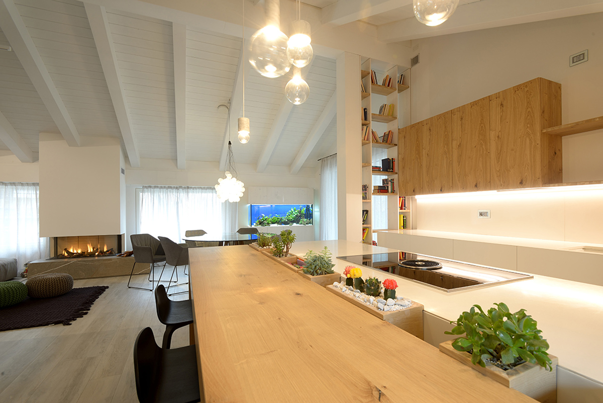 Piccoli angoli, come il piano porta computer estraibile dalla libreria o le fioriere in legno integrate nel bancone della cucina, rendono l’ambiente pratico e su misura. La libreria Inlungoeinlargo sfrutta l’altezza del tetto, evidenziando questa dimensione e diventando protagonista dello spazio.